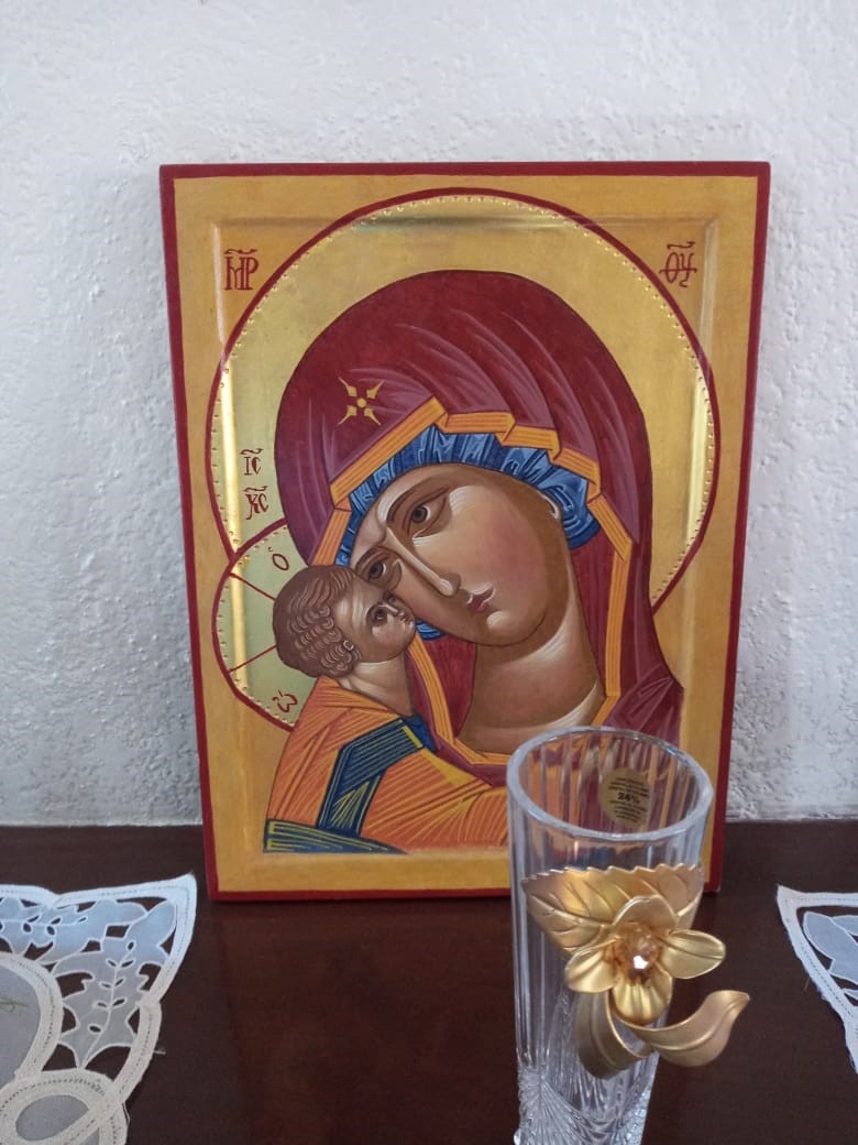 Desde el 2013 inicié con la iconografía, gracias a la explicación que me dio un sacerdote jesuita sobre cómo ayuda la oración a través de la iconografía sacra. Gracias al apoyo del párroco donde daba catecismo en Roma, recibí el primer curso. Después ,con ayuda de algunas amistades seguí escribiendo esporádicamente algunos iconos. La experiencia me enriquece mucho, me gusta.